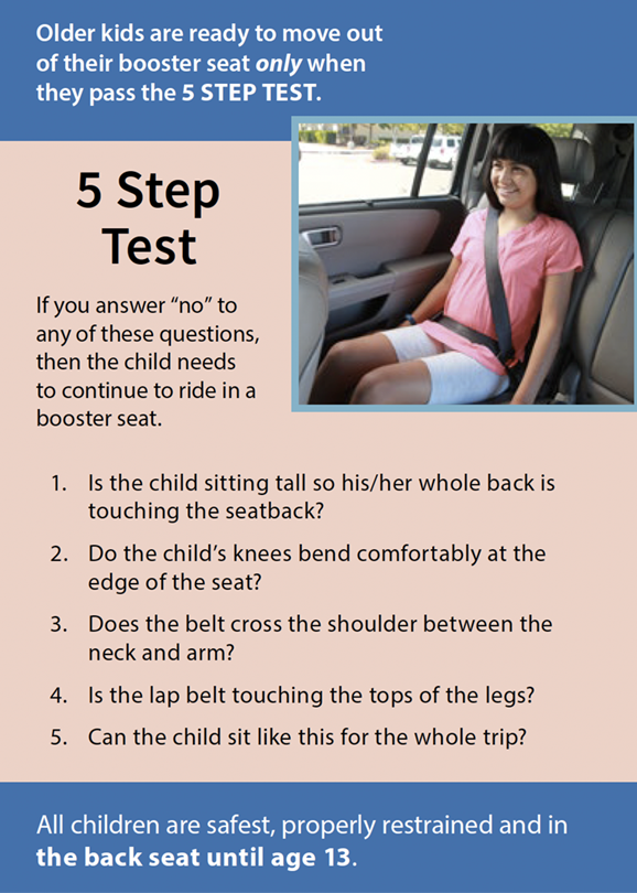 In 2025, Assembly Bill 435 was signed into law by Governor Newsom. Effective 2027, this law mandates the 5 Step Test for proper adult safety belt use for children 8-16 years of age. AB 435 also requires car rental agencies to provide child restraint systems for rent and display notices about the new law.